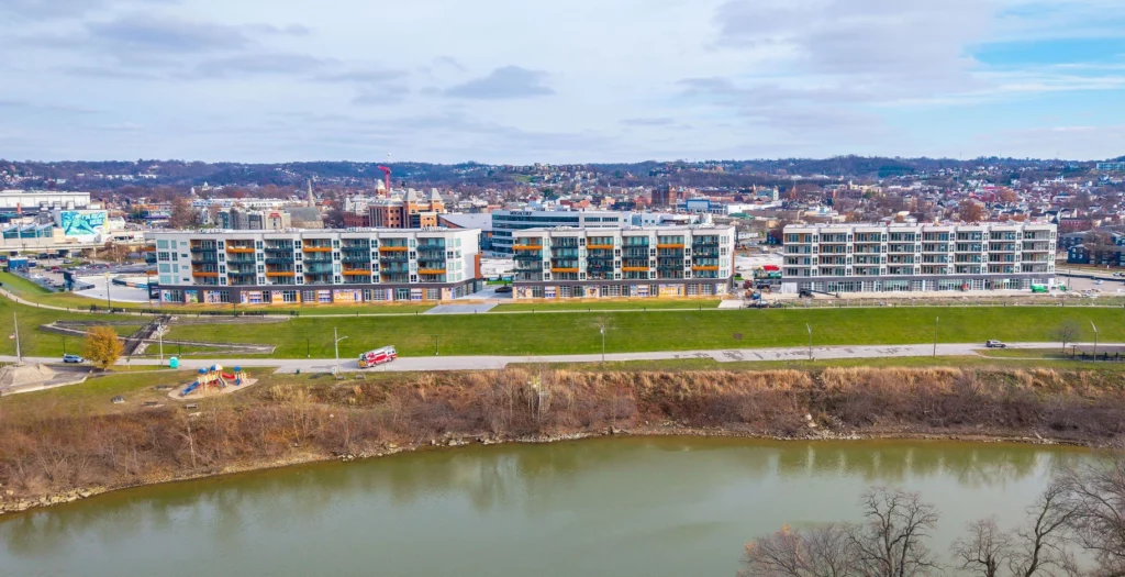 The car park garages have been built, with one open and a second in final stages. The concert venue has been open since 2021. Ovation Office 1 is open and thriving with business and patient care taking place. The Homewood Suites by Hilton is open. Now is your chance to own something here, too. There will only ever be a limited number of homes built next to the park, overlooking the two rivers with the best view of Cincinnati. Don’t miss your opportunity to own one of these homes.