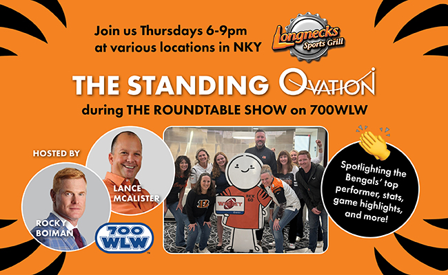 Join the fun with Rocky Boiman & Lance McAlister for THE ROUNDTABLE SHOW on 700 WLW live and in person at Longnecks Sports Grill as they talk Bengals football and announce The Standing Ovation player, play or highlight of the game!